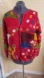 Vibrant knit cardigan featuring a mix of red, green, blue, and yellow colors. Unique patchwork design with button closure.