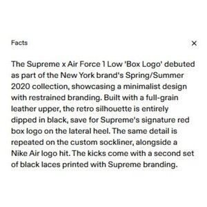 The SUPREME x AIR FORCE 1 Low 'Box Logo' sneakers in Supreme Black, released in 2020, offer a stylish and limited edition addition to any streetwear collection. Crafted from full-grain leather with matching soles and detailing, these sneakers feature Supreme's iconic red box logo on the lateral heel. The minimalist design of the Nike Air Force 1 silhouette is elevated with custom sockliners and an additional set of laces showcasing further Supreme branding. These unisex sneakers, available in size M9/W11, are perfect for casual, activewear, or even workwear occasions. The midsole provides cushioning with Air technology, making them comfortable for all-day wear. Whether you're a collector or a streetwear enthusiast, these Supreme x Nike Air Force 1 collaboration sneakers are a must-have for any sneakerhead's wardrobe.