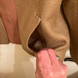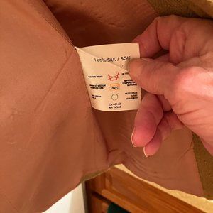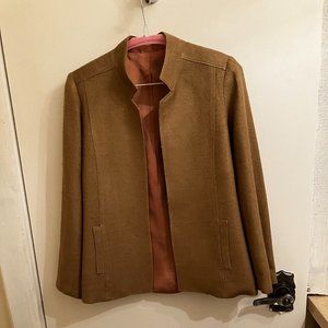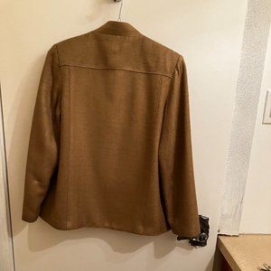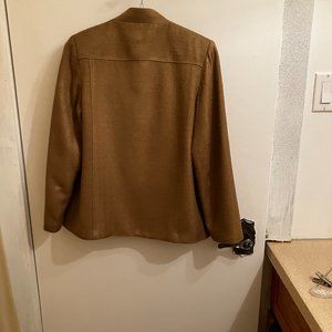 no tag but casual and dressy 100% raw silk jacket, dark rich gold in colour, fully lined, side slit pockets, manderin collar (?), like new, petite