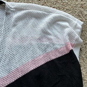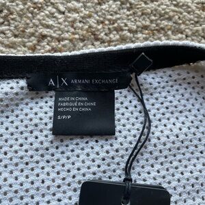 Brand new with tags. Armani exchange open front, short sleeve cardigan. Black/ white/ pink. The white and pink section is almost like a mesh, and then black part is a lightweight knit. Size S. When laying flat pit to pit is 20”