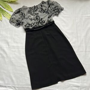 Crafted with sheer puffy sleeves and high neckline this two tone dress is styled with a defining belt for shapely sophistication.