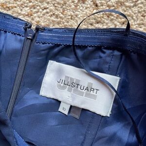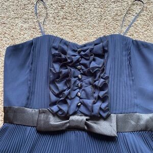 Brand new with tags. Gorgeous navy blue with black detailing. Spaghetti straps. Tuxedo style front. Sheer, lined fabric. Size 10. When laying flat pit to pit is 16.5”, waist is 14”, length is 38”.