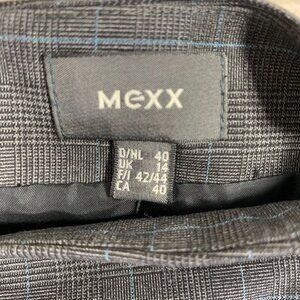Mexx navy and teal plaid pencil skirt. Pencil skirts are versatile and can be styled in various ways, suitable for both professional and casual settings. For a professional look, it can be paired with a tucked-in blouse and pumps, adding a blazer for extra sophistication. For a more relaxed style, it can be worn with a t-shirt or tank top, complemented by a denim jacket and pumps. The skirt is made from a blend of viscose and polyester and is designed to sit at the natural waist. It features a navy