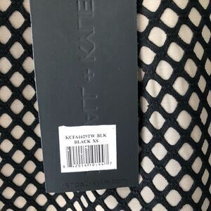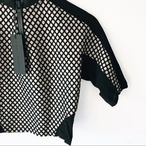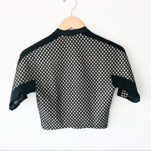 This athletic-inspired, curve-hugging crop top is styled with mesh texture, racing stripes and a sporty zip closure. 16 1/2" front length; 15 1/2" back length.