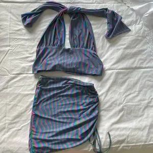 omighty purple squiggly set in xs <33 jaw string mini skirt & halter top, size xs but will fit up to us 6 because it is stretchy💗💜