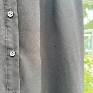 part of the back is open, and the other panels sheer. front of dress is double-lined. women's size small with elastic waist, very flattering and forgiving. buttons up to a twee collar and hits above the knee. tiny hole in the front