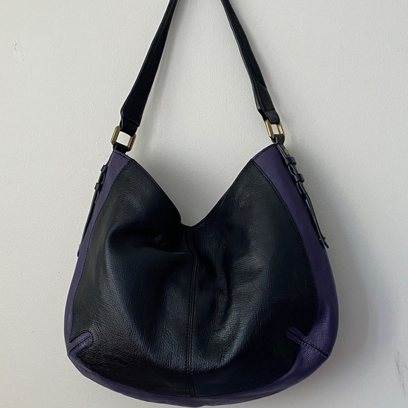 Elegant leather hobo bag with a unique buckle. Features a stylish black and purple design.