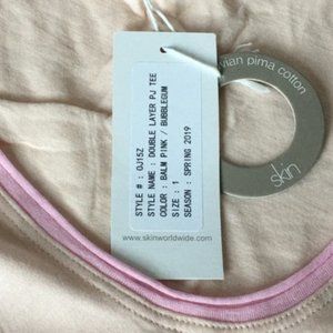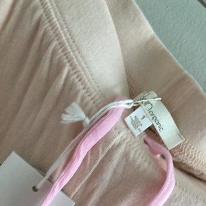 100% organic pima cotton. Beautiful luxurious soft material from skin. A light pink Elder layer with the double layered cotton on the inside, bubblegum pink piping On top and pants.