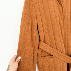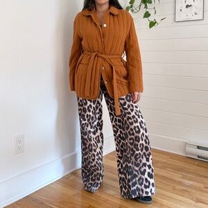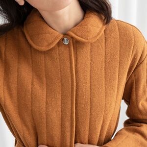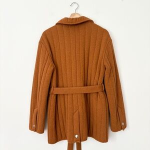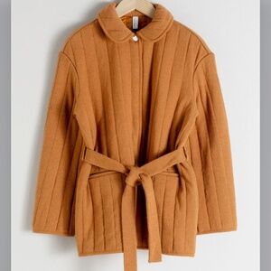 Collared textured quilted cotton blend jacket with a waist tie, two front pockets and exposed silver toned buttons.