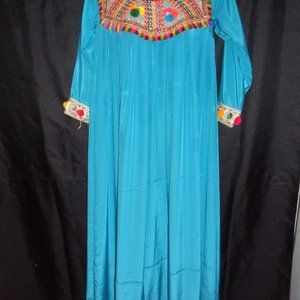 brand new never worn custom stitched flared shirt/frock with churidar/skinny pyjama/pants and scrunched dupatta.top and bottom are in same blue crepe material while the scarf is in different material in yellow shade.kameez has thread and mirror work.as it is a custom stitched set so no tags for size kindly check the measurements to be sure about the size .i think it should fit XS to small