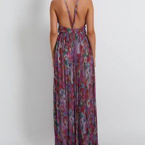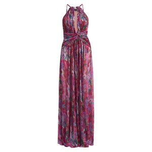 This floor-length gown is made from a sparkly printed Lurex fabric. A halter neckline with a keyhole cutout. Adjustable straps.