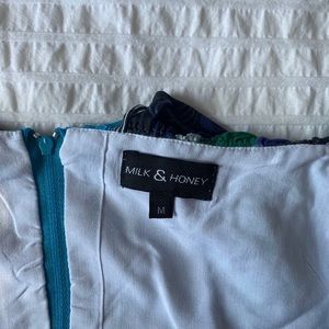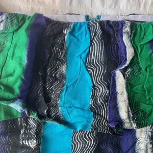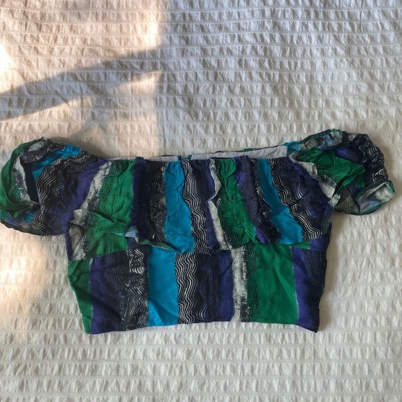 Colourful patterned off the shoulder top. Would look super cute w white jeans!