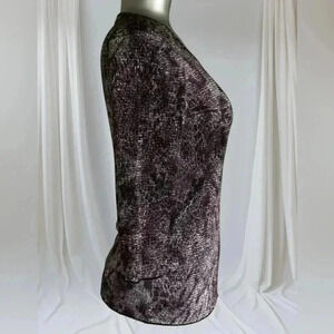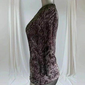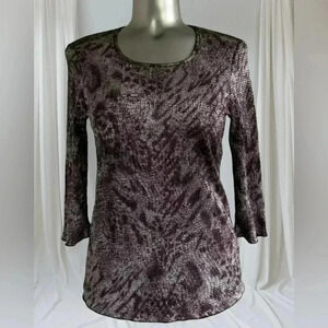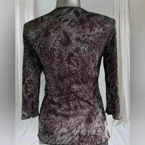 Purple and silver metallic, textured animal print, lettuce hem, sleeves 3/4s. 100% Polyester stretch fabric.