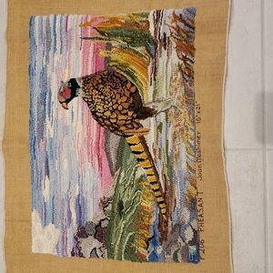 This lovely completed hook rug Pheasant is in very good condition. Unframed. Size of canvas 29.5" x 20" Size of Pheasant portrait 15" x 21". See photos.