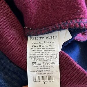 This Philipp Plein Crewneck Striped Sweatshirt is in very good, pre-owned condition. Super soft and luxurious fabric. Navy blue and maroon stripes. Two front pockets. Classic crewneck style and details. Size medium - please see pics for approximate measurements.