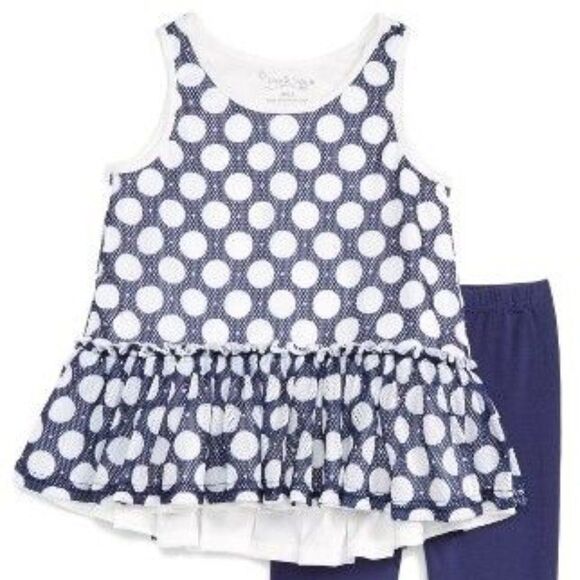 Pippa & Julie Navy Polka Dot Mesh Skirted Tank Top. UGH. Loooooove this top! Navy blue with white polkadots on mesh fabric. Cutest built in skirt with a white lining throughout. SUPER styled and ready to rock your rad little's wardrobe. Get it in your bundle with some shorts, jacket and hat for an adorable closet discount! EUC.