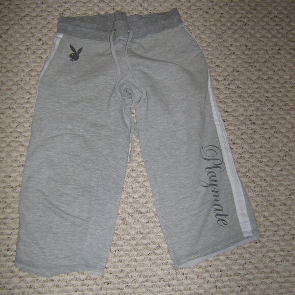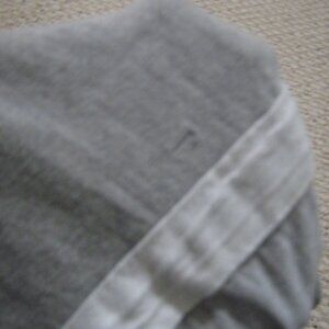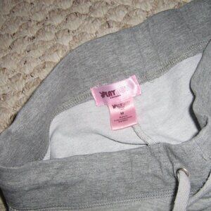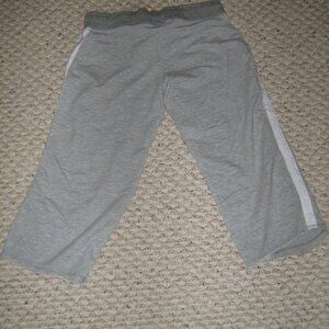 -lightweight material, distressed drawstring, white stripes down side, low waisted, very small tear mark on the side of front left leg
