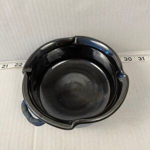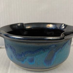 Stunning artist signed ceramic bowl in blues and blacks with some pink. Signed by the artist on the back. Scalloped edge and handle. Can be used as a serving bowl or as decor