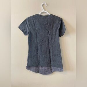 This vneck tee from Preloved Toronto is made sustainably in Canada using upcycled fabrics! The accents on this tshirt are crafted from vintage button down shirts. This makes a perfect gift or adds a unique piece to your closet! Dress it up or down. Perfect as a work top or as something casual with a pair of your favourite jeans or leggings.
