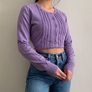 from the brand only mine, this is a women’s solid purple long sleeve crew neck button down cardigan. it features matching purple buttons and frills along the front of the shirt. it’s made of light fabric that offers a bit of stretch