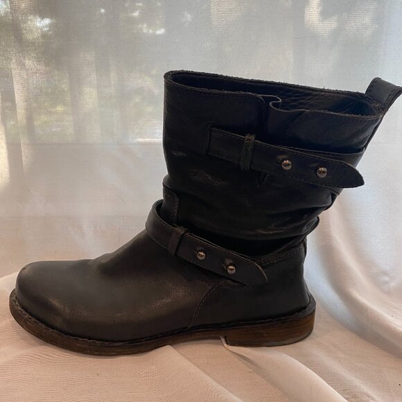 Black leather, short biker boots. Soft leather upper, low heel. Double straps with peg-in-hole closures.