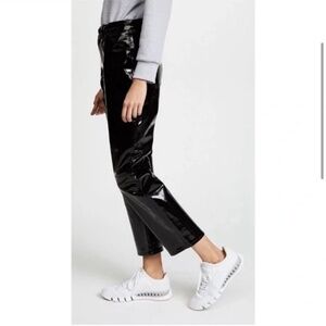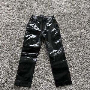 Sleek black patent leather pants. High-waisted design. Perfect for a chic look.