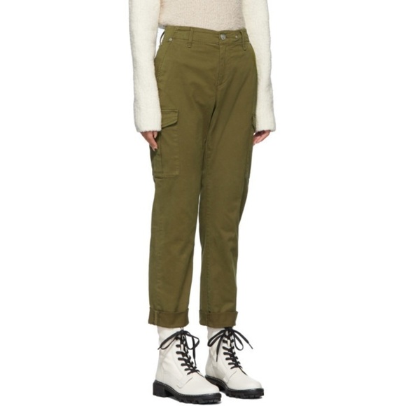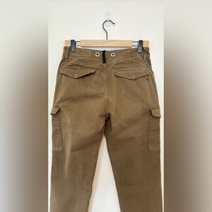 Relaxed-fit garment-dyed stretch cotton twill trousers in khaki. Low-rise. Four-pocket styling. Belt loops at waistband. Flap pockets at outseams. Eyelet vents and signature topstitching in white at back waistband. Logo embroidered in black at back pocket. Rolled cuffs. Zip-fly. Logo-engraved silver-tone hardware.