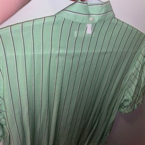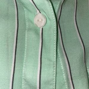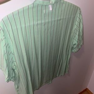 Short sleeve button-front shirt with a pinstripe pattern and cropped hem.