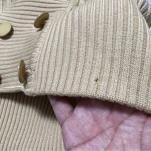 Good condition - minor tear at the bottom front (outer layer only) - can be easily fixed but I’ll leave it as is. Very cute vintage cable knit sweater from Escada - rare find! It has a silk like / satin strips in between the knits. Color is more vibrant in person. 100% wool with extra button still attached. Ribbed cuff & hem.