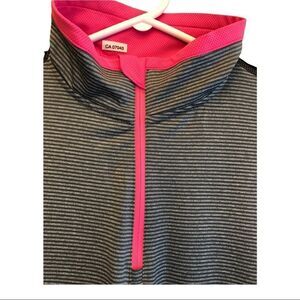 Like new, this gorgeous half zip jacket in black stripes, black and pink trim is great to run, walk or hike in. Breathable and light weight, size medium. See measurements.