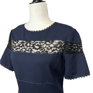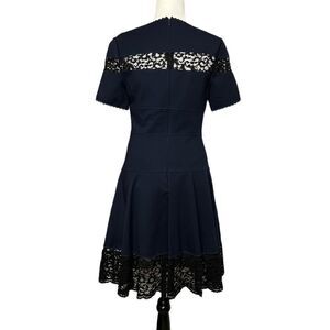 Rebecca Taylor ponte dress with lace trim. Jewel neckline. Short sleeves. Soutache trim at neck and cuffs. A-line silhouette. Scalloped hem. Hidden back zip closure.