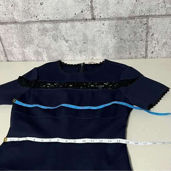 Rebecca Taylor ponte dress with lace trim. Jewel neckline. Short sleeves. Soutache trim at neck and cuffs. A-line silhouette. Scalloped hem. Hidden back zip closure.