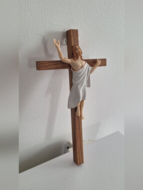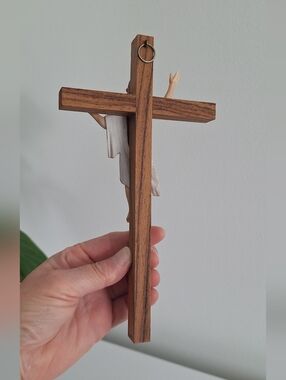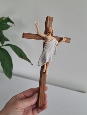 Wooden crucifix with the resurrected Jesus, arms outstretched towards heaven.