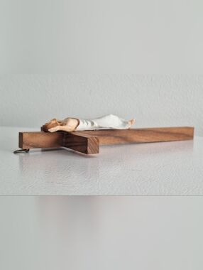 Crucifix en bois avec Jésus ressuscité. Les bras ouverts vers le ciel.