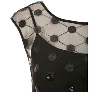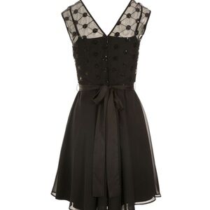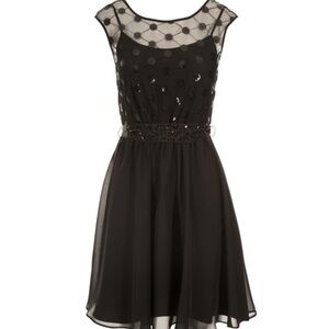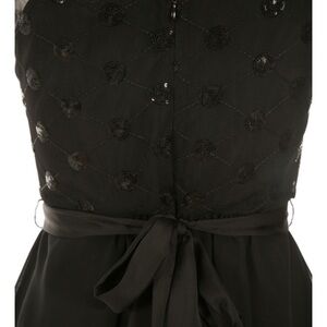 This beautiful dress features a lace sheer sequin bodice with a jewel embellished ribbon belt. Pair this dress with heels and a simple necklace for a romantic and feminine look.