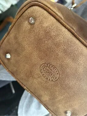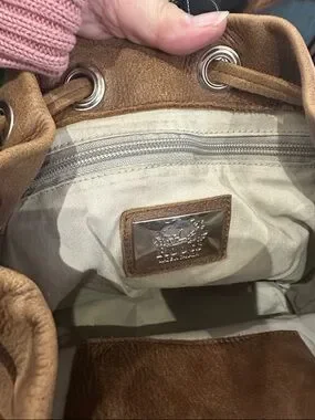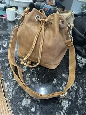 EUC Stylish bucket bag with drawstring closure. Soft leather exterior and adjustable strap for comfortable wear. Polished metal grommets add subtle hardware detail 8x6 , 9” tall adjustable strap for crossbody or shoulder style
