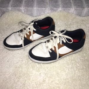 Brand new only worn a few times. Slightly dusty on the white leather, but easy to clean. No sole wear and tear.