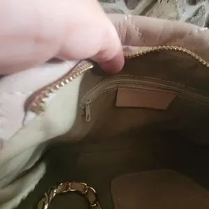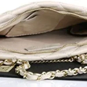 À l'intérieur, il y a deux compartiments principaux, séparés au milieu par un compartiment central, zippé, avec un autre compartiment zippé dans la doublure arrière du sac, et une petite poche de vanité à l'avant. Les poignées/bandoulière sont en métal doré avec une bande de cuir entrelacée assortie au sac.