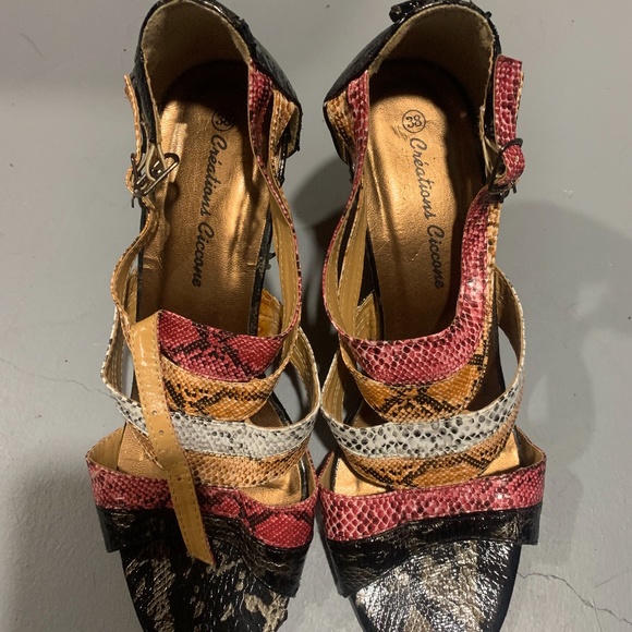 Never worn multi-coloured high heel sandals - approximately 2 1/2 inches. Sort of snakeskin look.