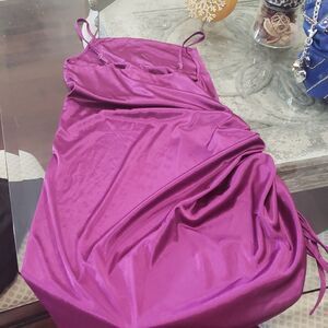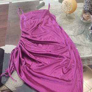 Sulozom Women's Scoop Neck Drawstring Sleeveless Spaghetti Strap Ruched Satin Dress purple
