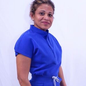 this is a two piece scrub set in a vibrant blue color includes a short sleeve top with mandarin callar style and matching cargo pants with drawstring waves. This set is designed for comfort and functionality.