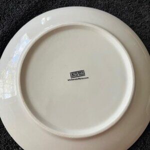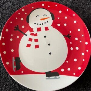 Festive plate with a snowman design. Various winter scenes, snowmen are playing hockey, skating, sledding and skiing, new in box, box was opened in order to photograph, never used, from Kitchen Stuff Plus,