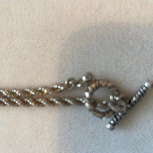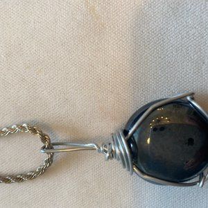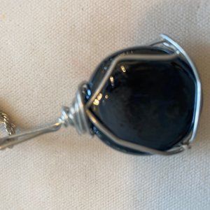 This stone is a natural agate that's been polished to a shiny black. Wrapped in silver plate wire.