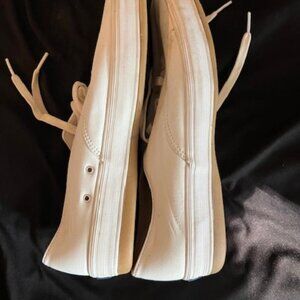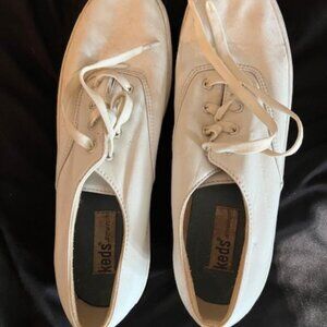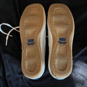 white Keds stretch walking shoe, man made upper but has a leather look to it, rubber bottoms, well worn but decent shape, lace up