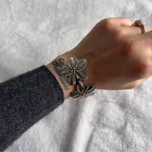 90s vintage floral silver boho asymmetrical bangle open cuff bracelet
