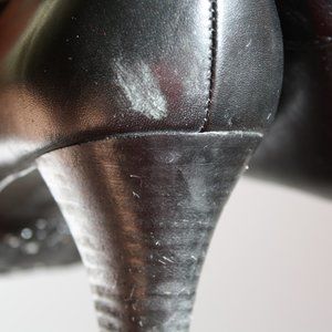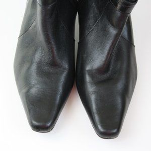 Beautiful black leather boots with comfortable rubber sole. iFlex by Anne Klein. Size 7 1/2 M. Cute buckle and strap detail. Elongated pointy toe that is squared off. Very nice looking boots. Heel is 2 inches. Comfortable to wear. there is some wear on the back of one boot and on the toe.Nothing Major. Please see photos.