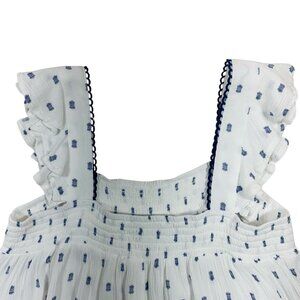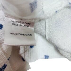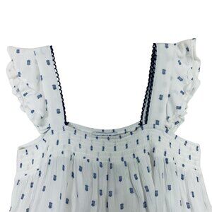 loose, flowing , ruffle sleeves, and delicate blue patterns on a white background. lightweight fabric, suitable for warm weather. The neckline and arm openings are trimmed with a dark blue scalloped edge, adding a subtle contrast to the overall design. Baby doll tops are known for their comfortable and flattering silhouette, often featuring a high waistline that flares out towards the hem.