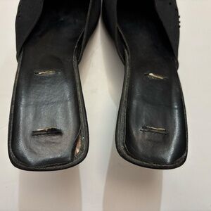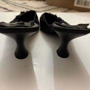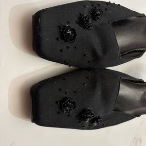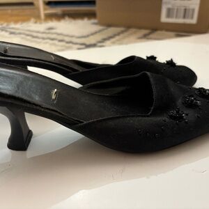 SOOO cute . adorable satin slip on heels, with sequin flowers, black satin kitten heel
