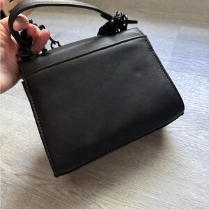 Chic and versatile crossbody bag. Features a sleek black design. Perfect for day or night outings.