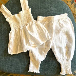 Gorgeous and gauzy ensemble. A pure and precious look for your new summer baby, perfect if you need to be out and about on really hot days. Handmade with so many subtle but beautiful choices. Flecked material has slightest sheen, delicate guazy cotton pants and top have finished/serged edges for durability, and smocking on legs and chest keep outfit comfortably in place for baby.